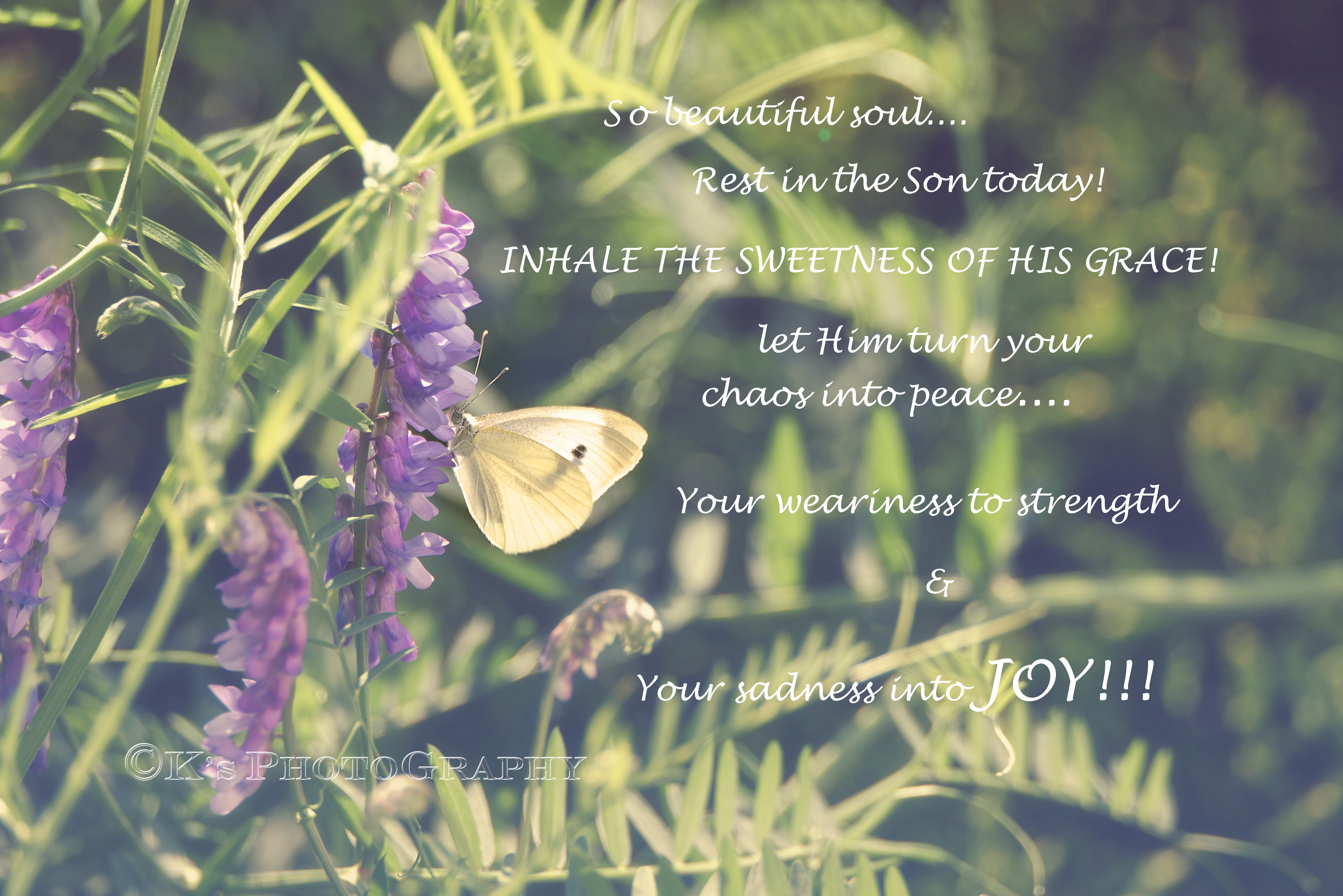 Down and out because of weaknesses and failure? ~ No way, not you! “Note to self” ~ God is with you and on your side! He has your back and your problem! Your weaknesses may discourage you but they are His delight. He wants you empty ~ empty of ‘Self’ and that’s where He works to bring you into the fullness of His purpose in your life and make it all count for now and for eternity. Trust Him for that. All that human frailty is your ticket to an awesome power that only God gives to His own. So, beautiful soul, enough of “Why Me?” Get before the Lord and look up into the heavens to see His majesty and authority in your world. It’s all yours when you delight in Him and talk with Him and seek His divine counsel and walk in His divine way. So for now ~ just wait on Him and let Him do the work in you!